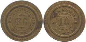 Pas d’explication pour les initiales MG ni FG, les documents consultés (entre 1908 et 1913) mentionnent A.Guiraud. Serait-ce une façon … Lire la suite de Jetons divers – Paris (Seine) – Distributeurs automatiques / Guiraud