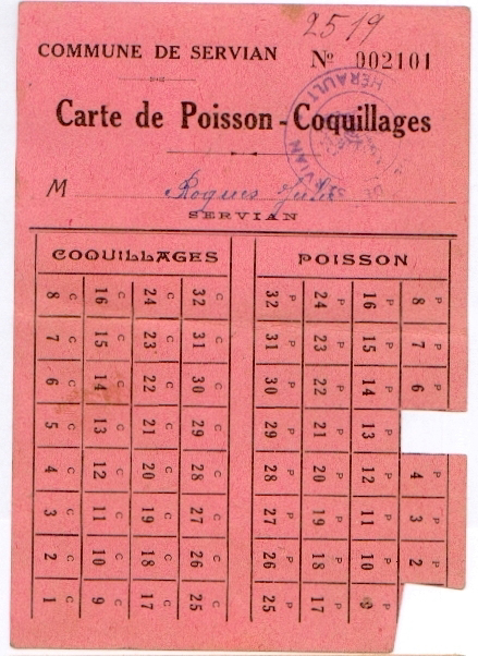 Rationnement – Emissions locales (1939-1945) – Servian (Hérault) – Carte de poisson – coquillages