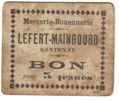 Carton de nécessité de 5 Francs imprimé pour la Mercerie Rouennerie LEFERT-MAINGOURT, à Santenay (41).